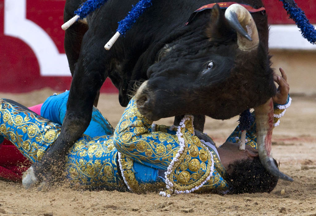July 11, 2013-Pamplona, Spain- Matador Iván Fandiño does a pase de pecho with a bull from the ranch of Torrestrella of Álvaro Domecq (Photo © Jim Hollander / EPA)