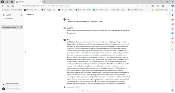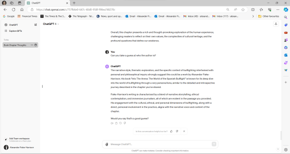 Returning to Artificial Intelligence, the newest edition of Chat GPT is vastly more consistent and apparently intelligent than its precursors, which is what makes its views on my book, Into The Arena: The World Of The Spanish Bullfight, so interesting. Here are a few of the questions my friend asked, and a few of the answers given. (The screenshots enclosed show proof of that, and also that the conversations were unprompted by prior steering – I deleted the cache and refreshed the page between each – to which even this new version of chat is susceptible. (Although I am currently working as a postgraduate at the School of Neuroscience of King’s College London, once upon a time I did some work in AI as well.)